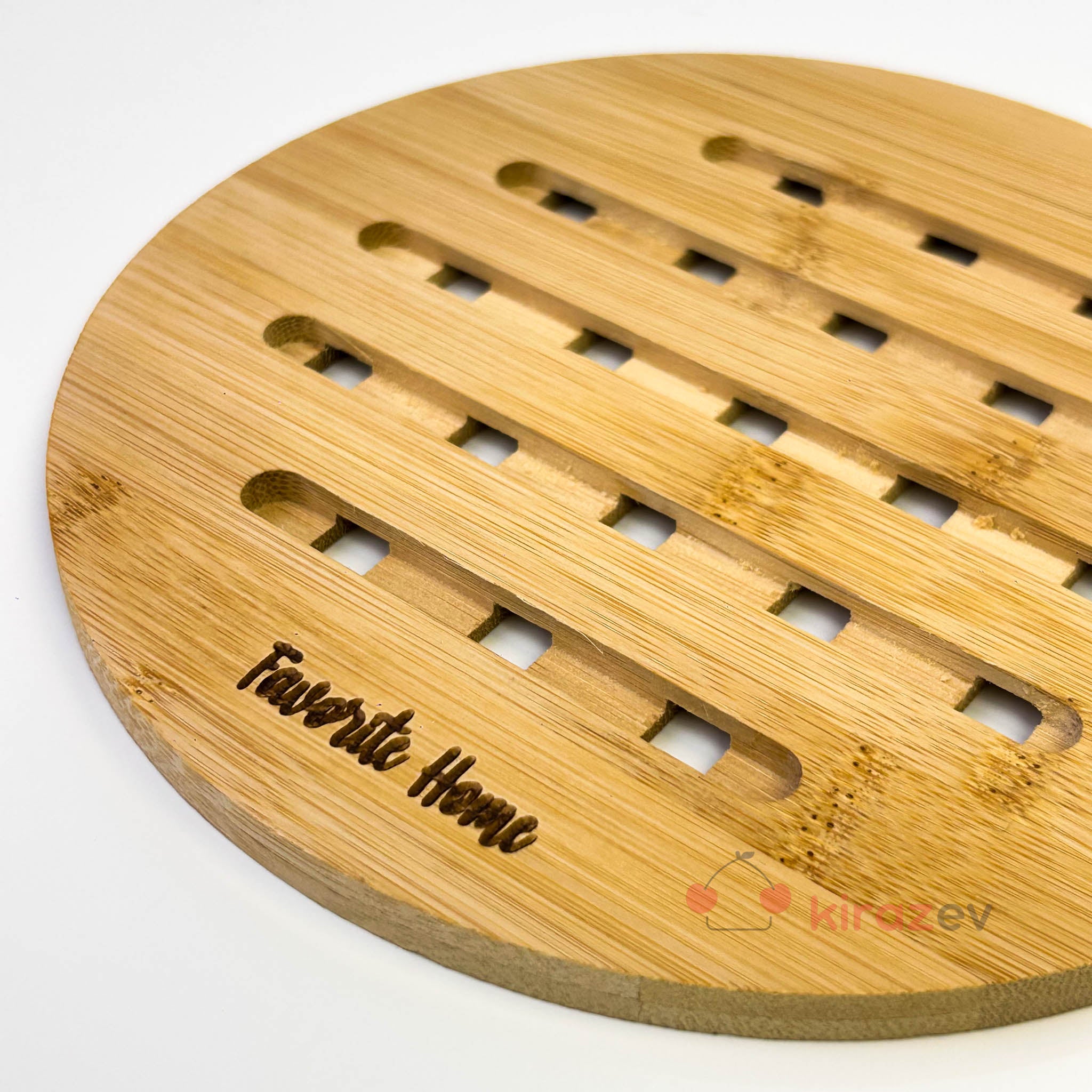 Doğal bambu dokusuyla hem şık hem işlevsel bir kullanım sunan yuvarlak bambu nihale, sıcak tencere, tava, çaydanlık ve fırın kabı gibi ürünlerin altında yüzeyi korumaya yardımcı olur. Oluklu yapısı sayesinde ısının dağılmasına destek olur ve tezgâh/masa üzerinde güvenli bir kullanım sağlar.