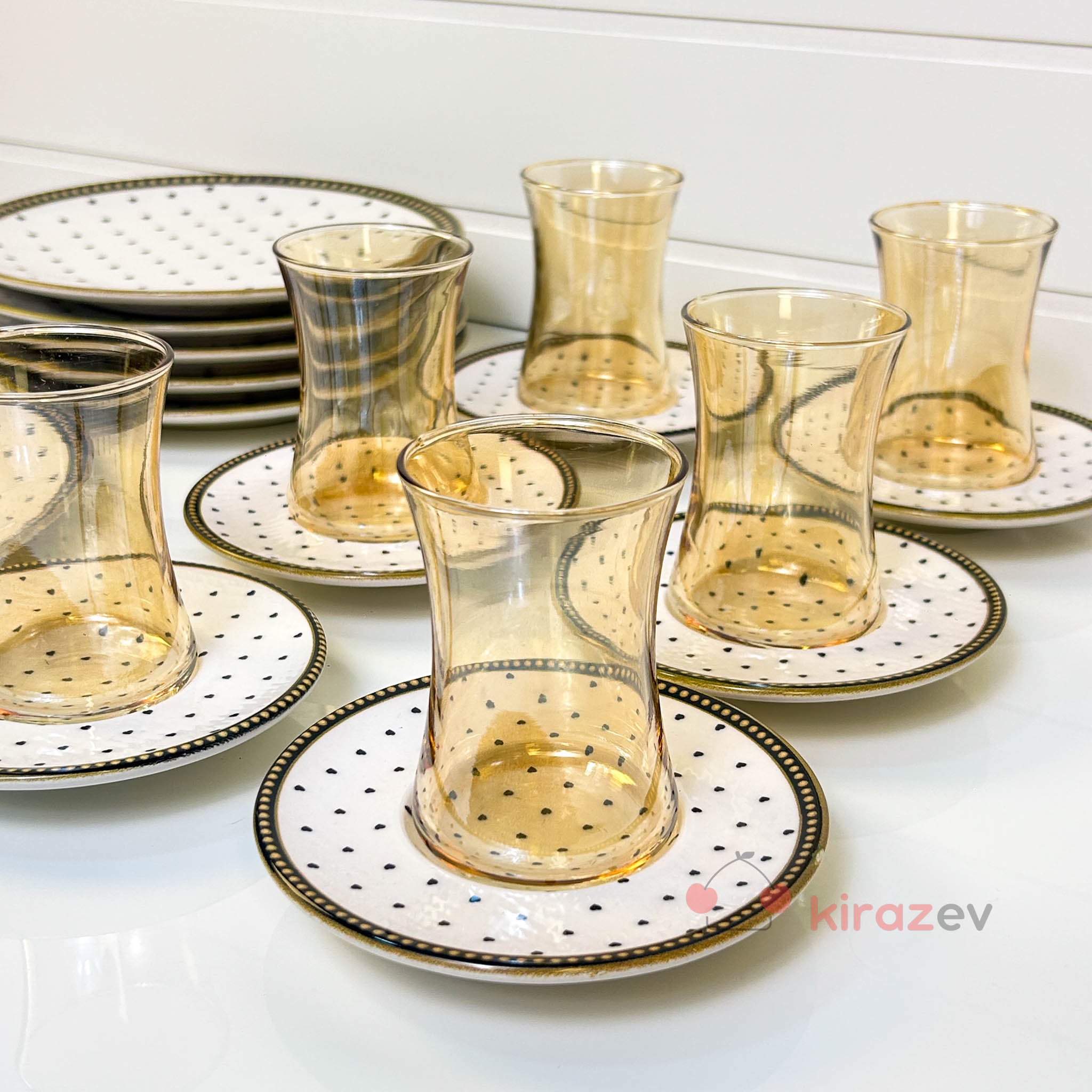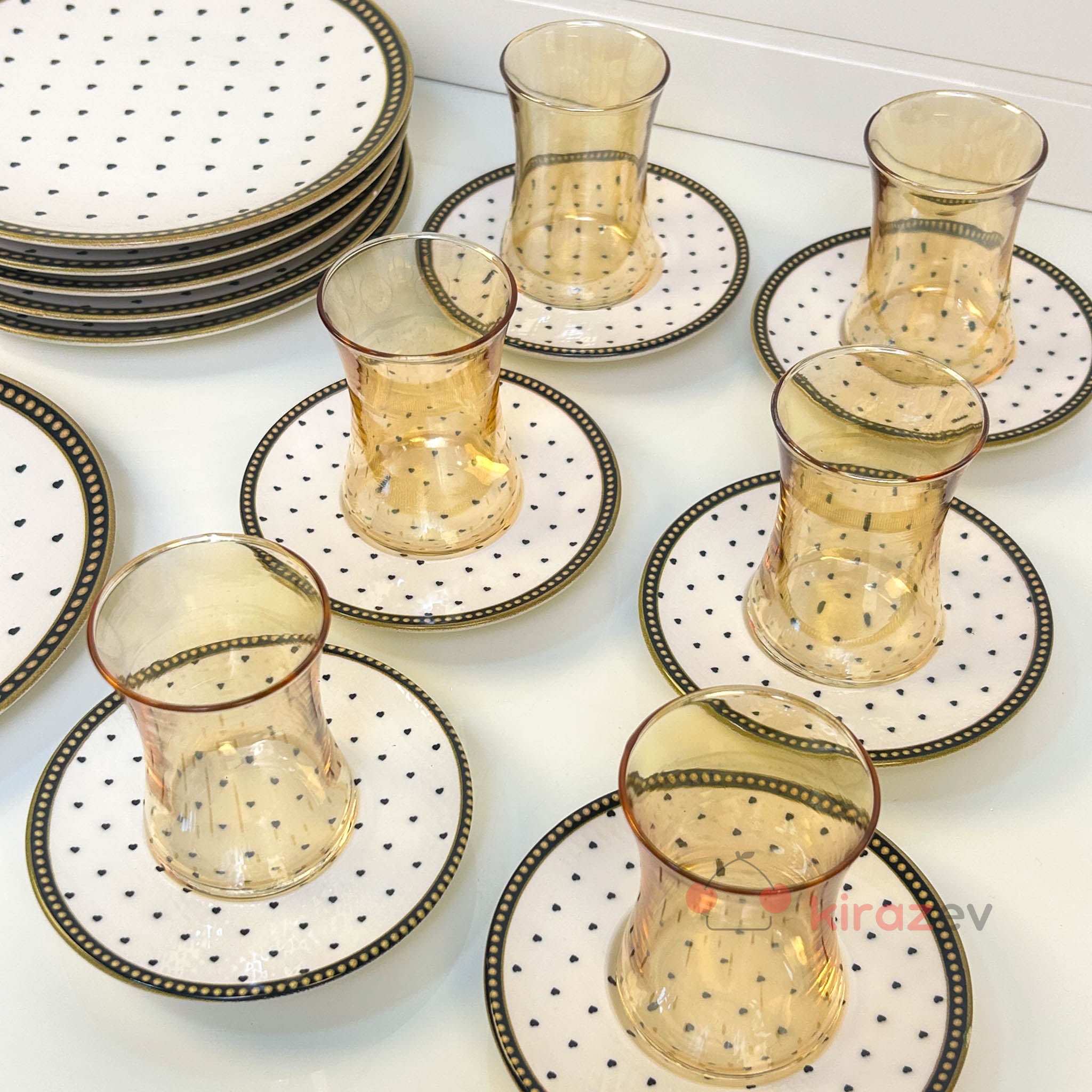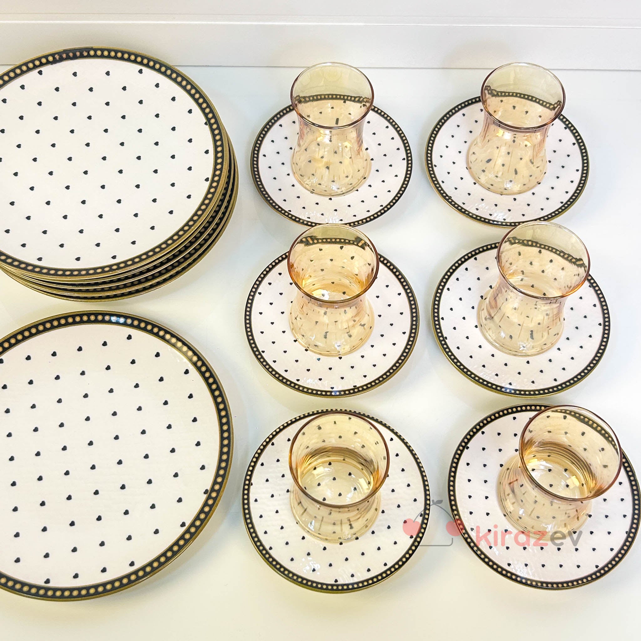 Siyah kalp desenli tabakları ve sıcak tonlu cam çay bardaklarıyla öne çıkan set, sofralara romantik ve zarif bir dokunuş katar. Günlük kullanımda keyifli, misafir ağırlarken ise etkileyici bir tamamlayıcıdır.