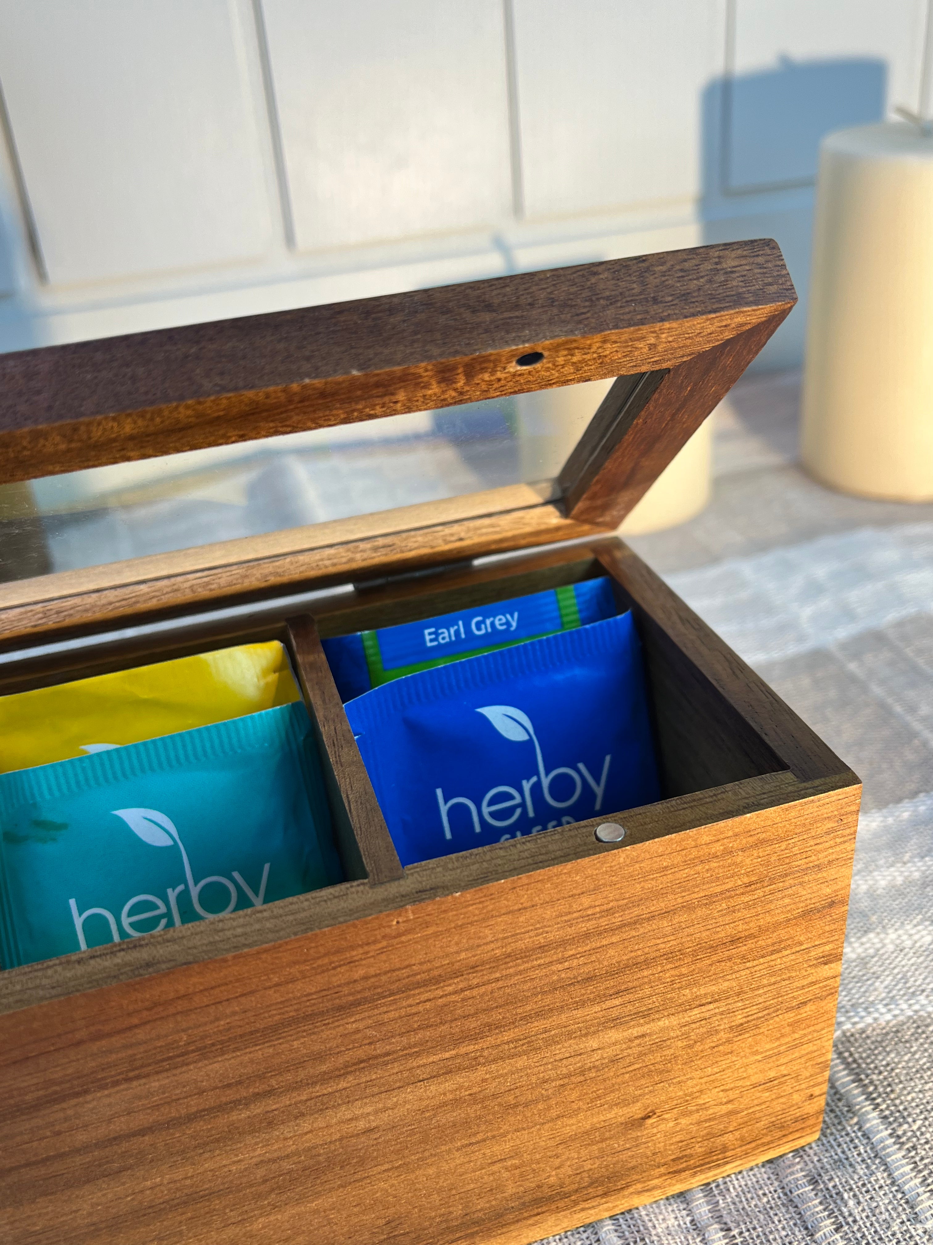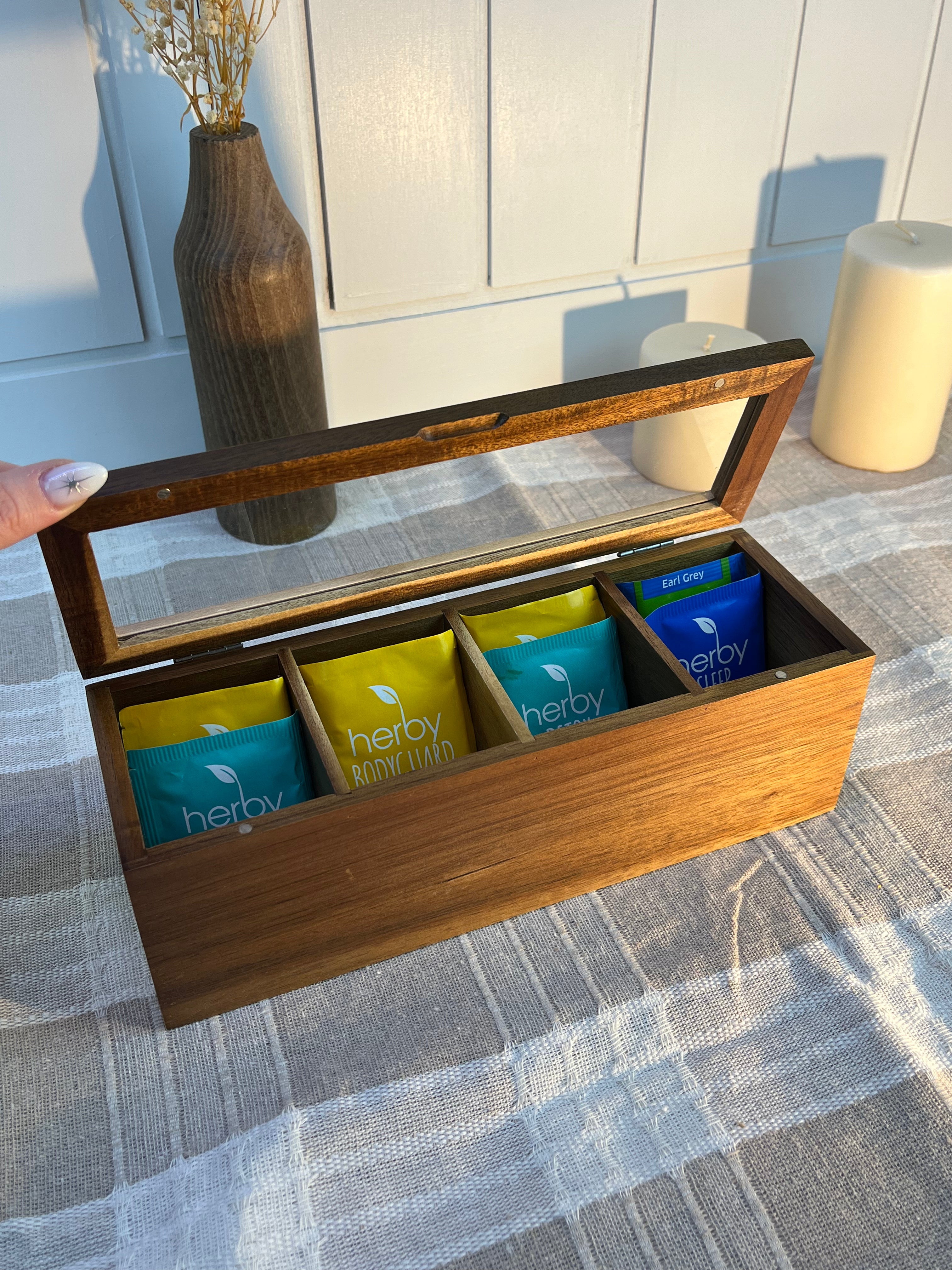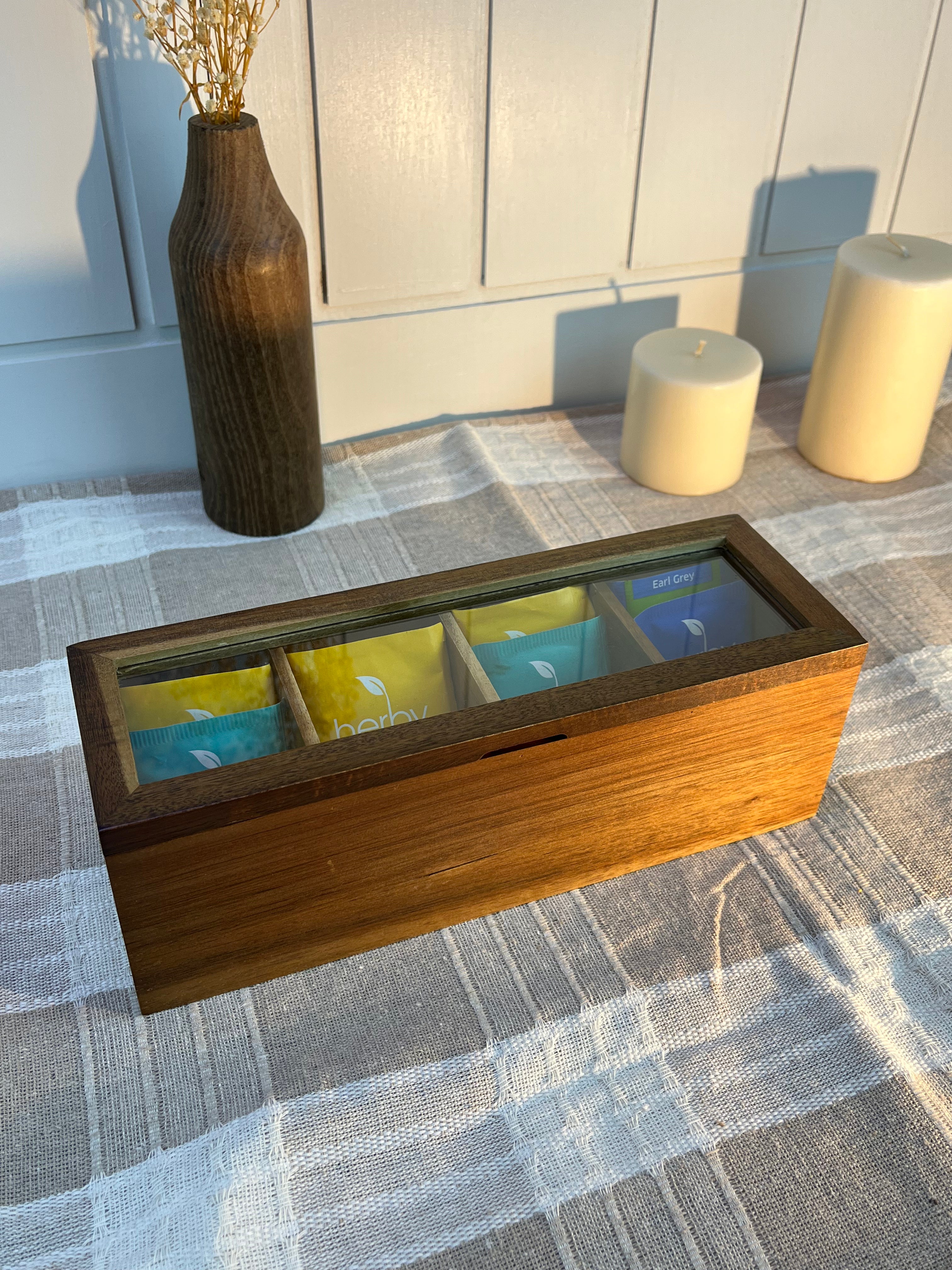 Doğal akasya ağacından üretilen 4 bölmeli çay kutusu, çay poşetlerinizi ve bitki çaylarınızı düzenli ve şık bir şekilde saklamanız için tasarlanmıştır. Doğal ahşap dokusu sayesinde mutfak ve çay köşelerine sıcak ve estetik bir görünüm kazandırır.