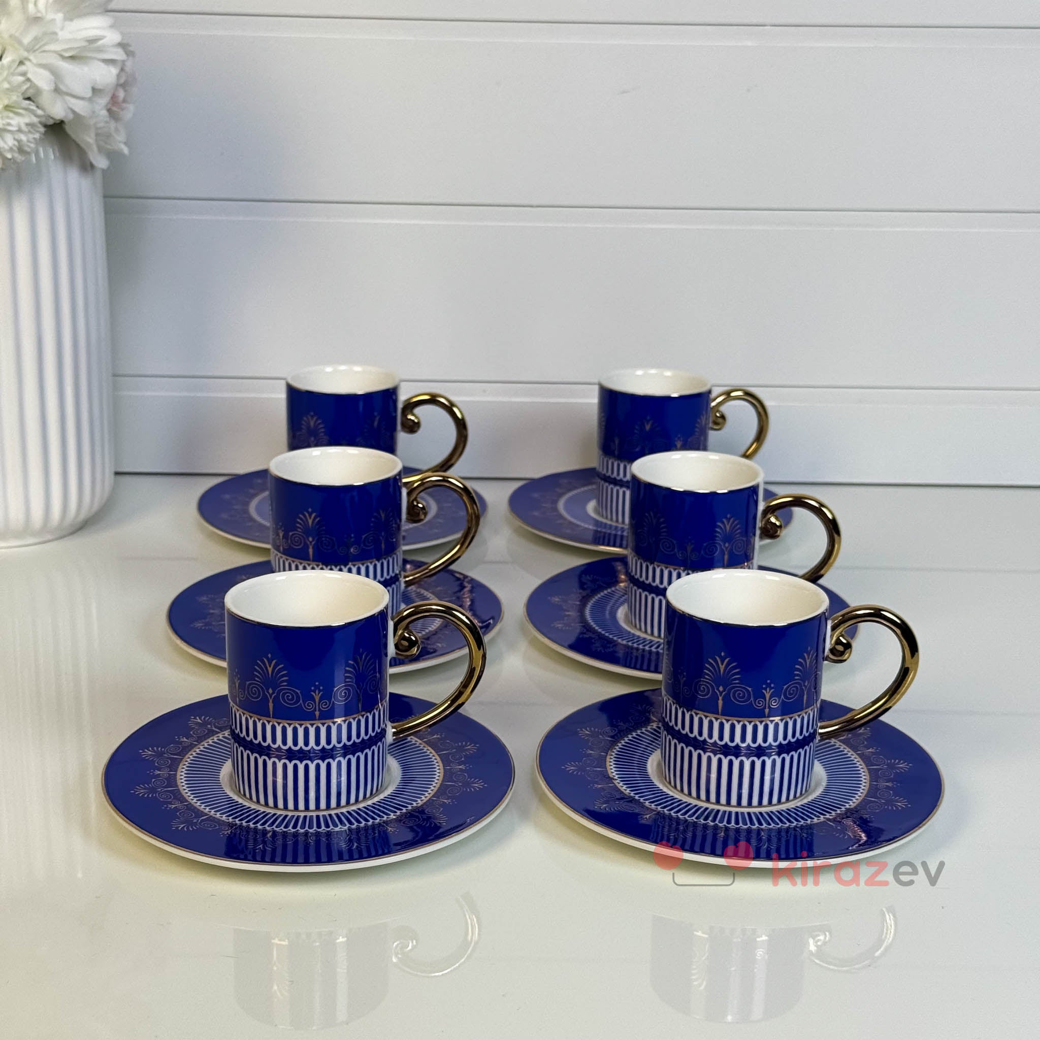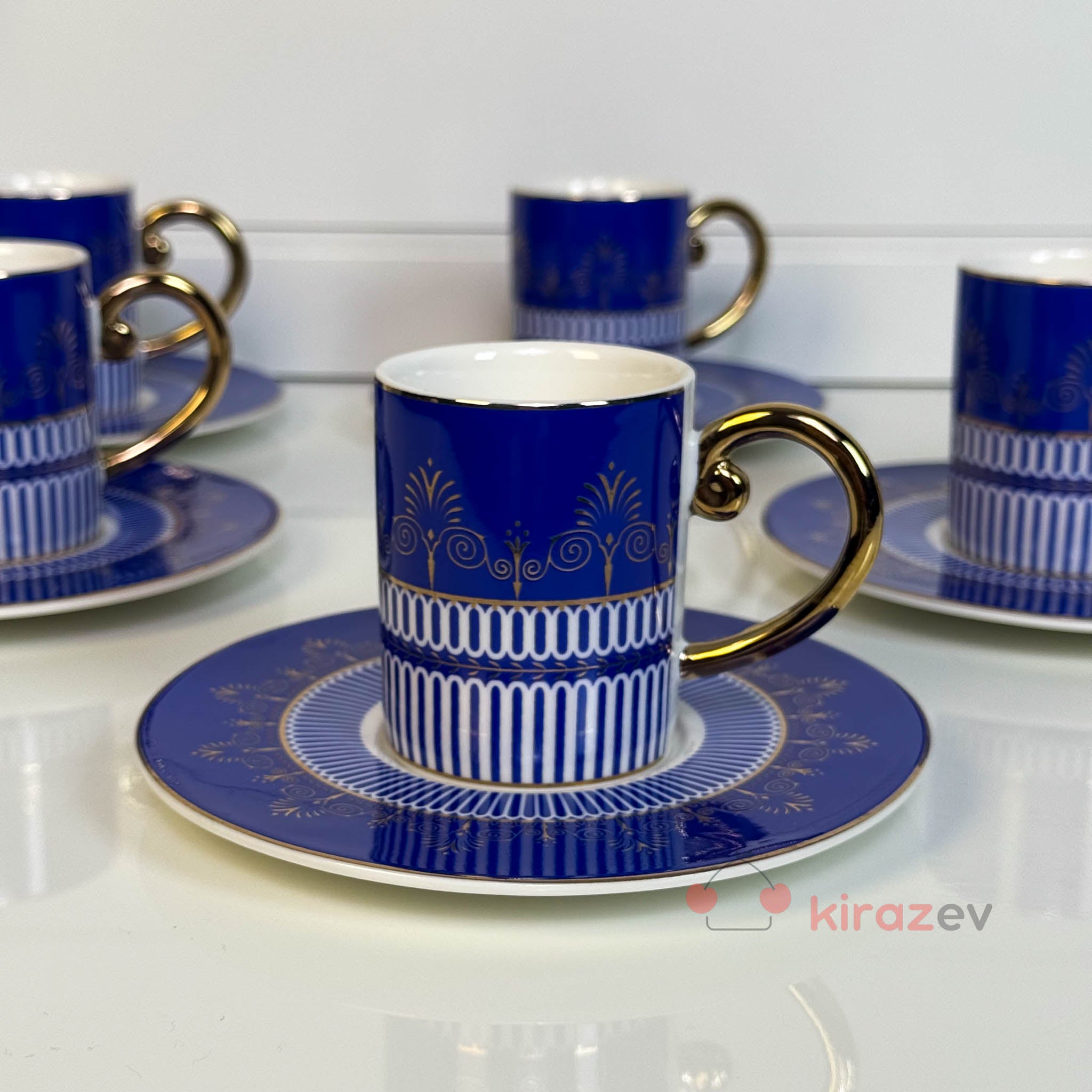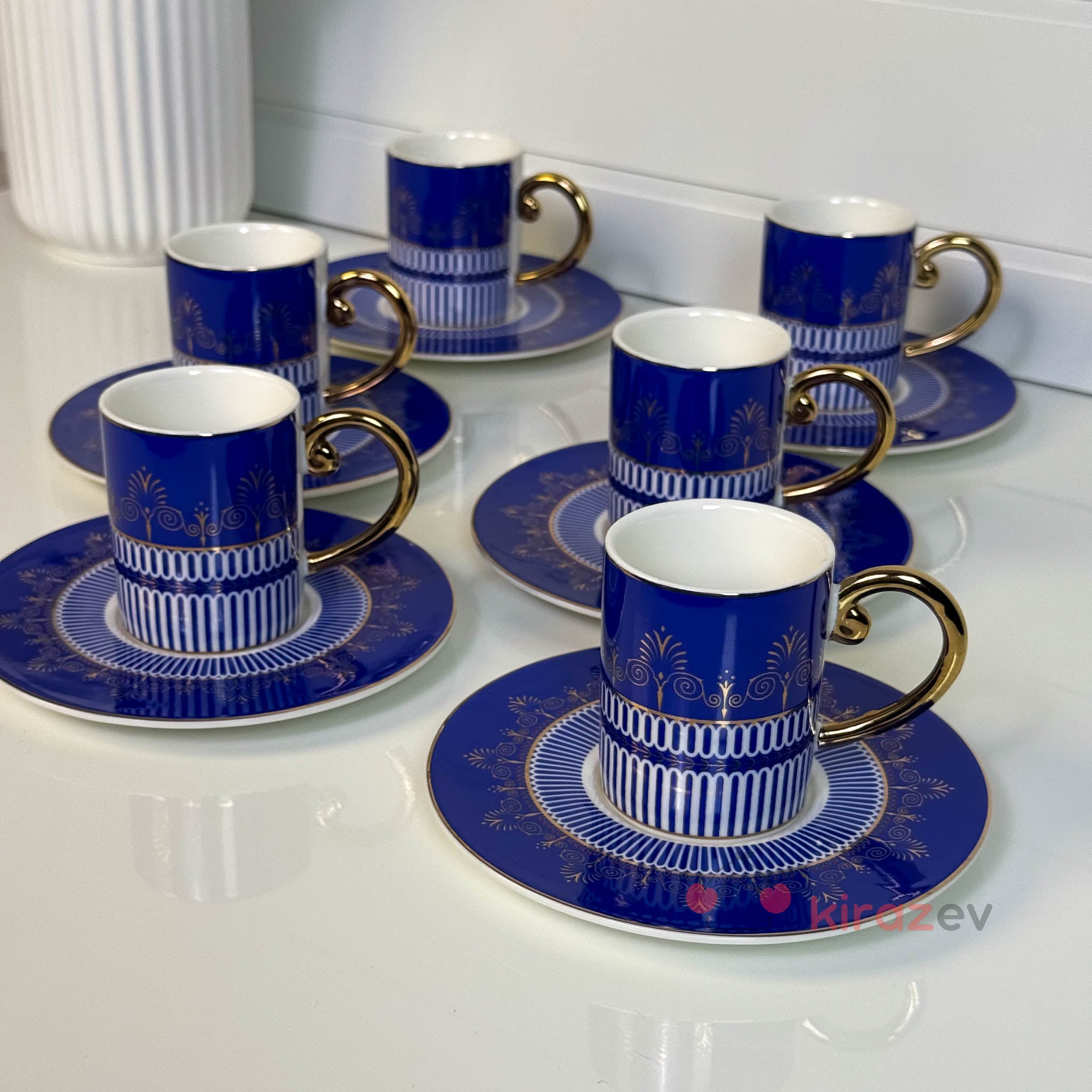 Asil lacivert rengi ve altın detaylarıyla öne çıkan royal lacivert porselen kahve fincan seti, kahve sunumlarına zarafet ve şıklık katar. Özel davetlerden günlük kullanıma kadar her ortamda göz alıcı bir sunum sağlar.