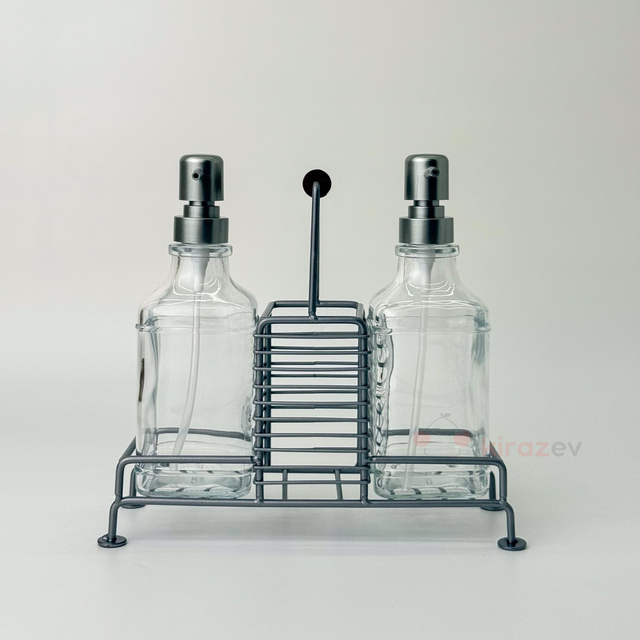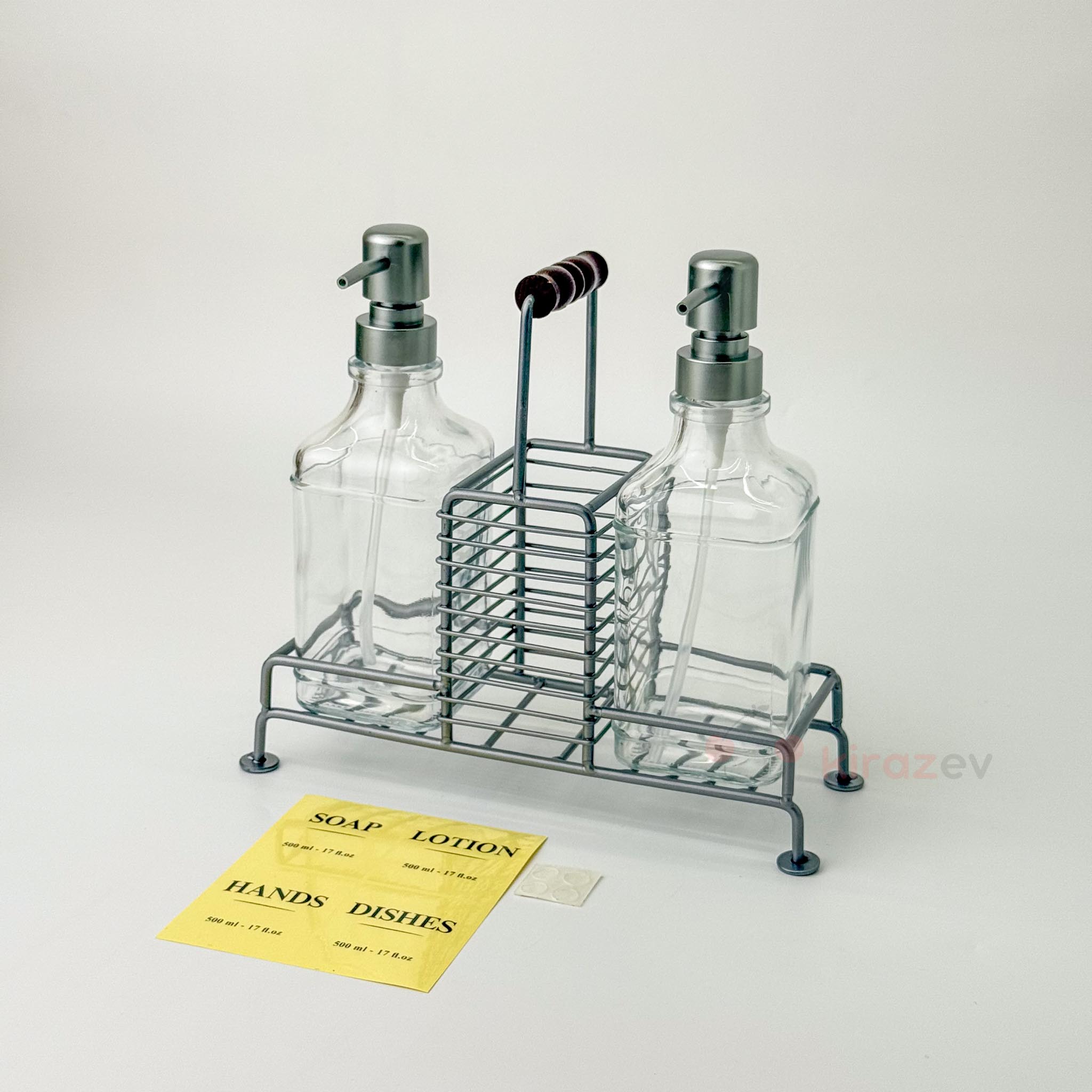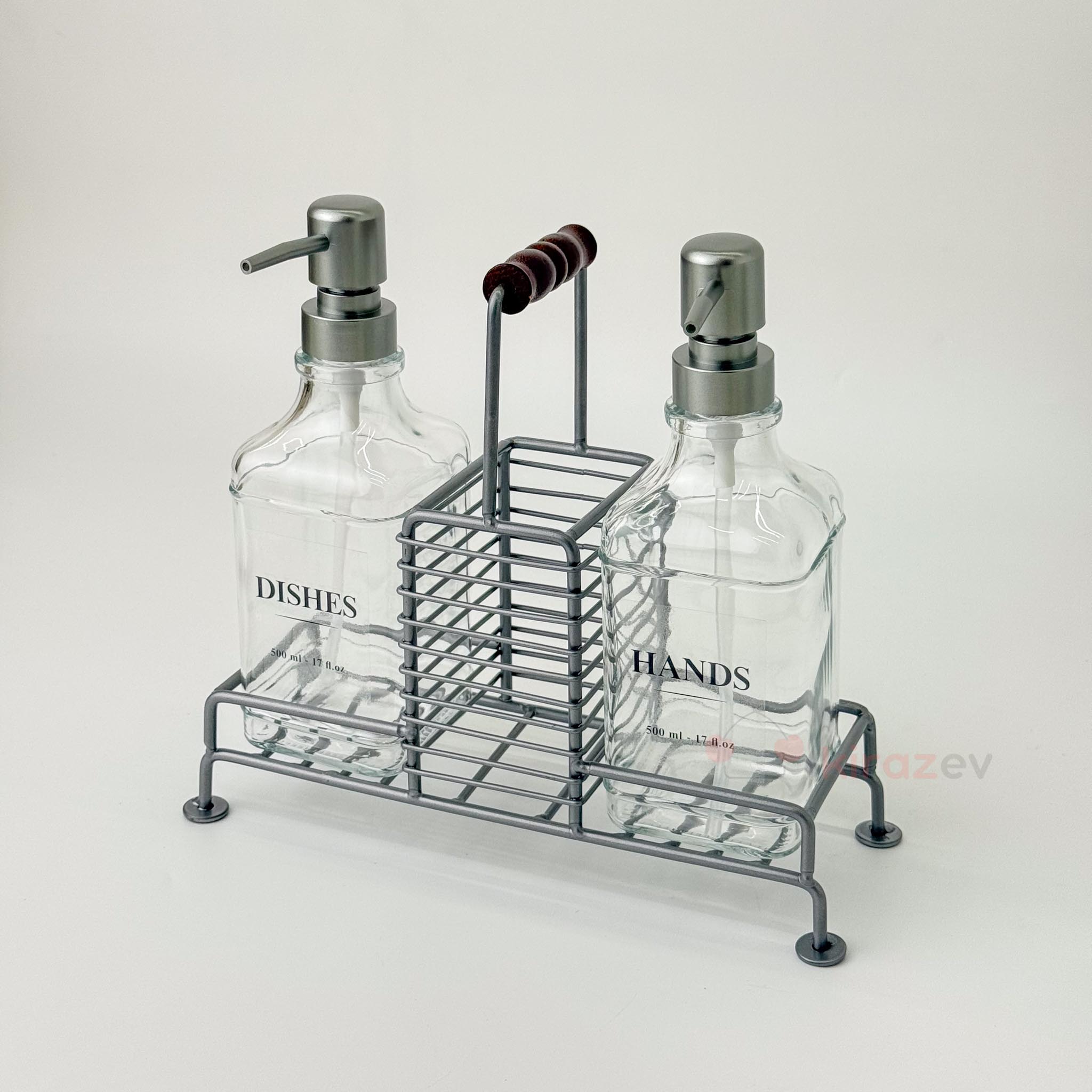 Şık ve işlevsel bir çözüm arayanlar için özel tasarlanan bu 2’li sıvı sabunluk seti, gri metal kulplu standı ve cam şişeleriyle hem mutfak hem banyo kullanımına uygundur. Ürünle birlikte gelen etiket seçenekleri sayesinde sabunluklarınızı kişiselleştirebilirsiniz.