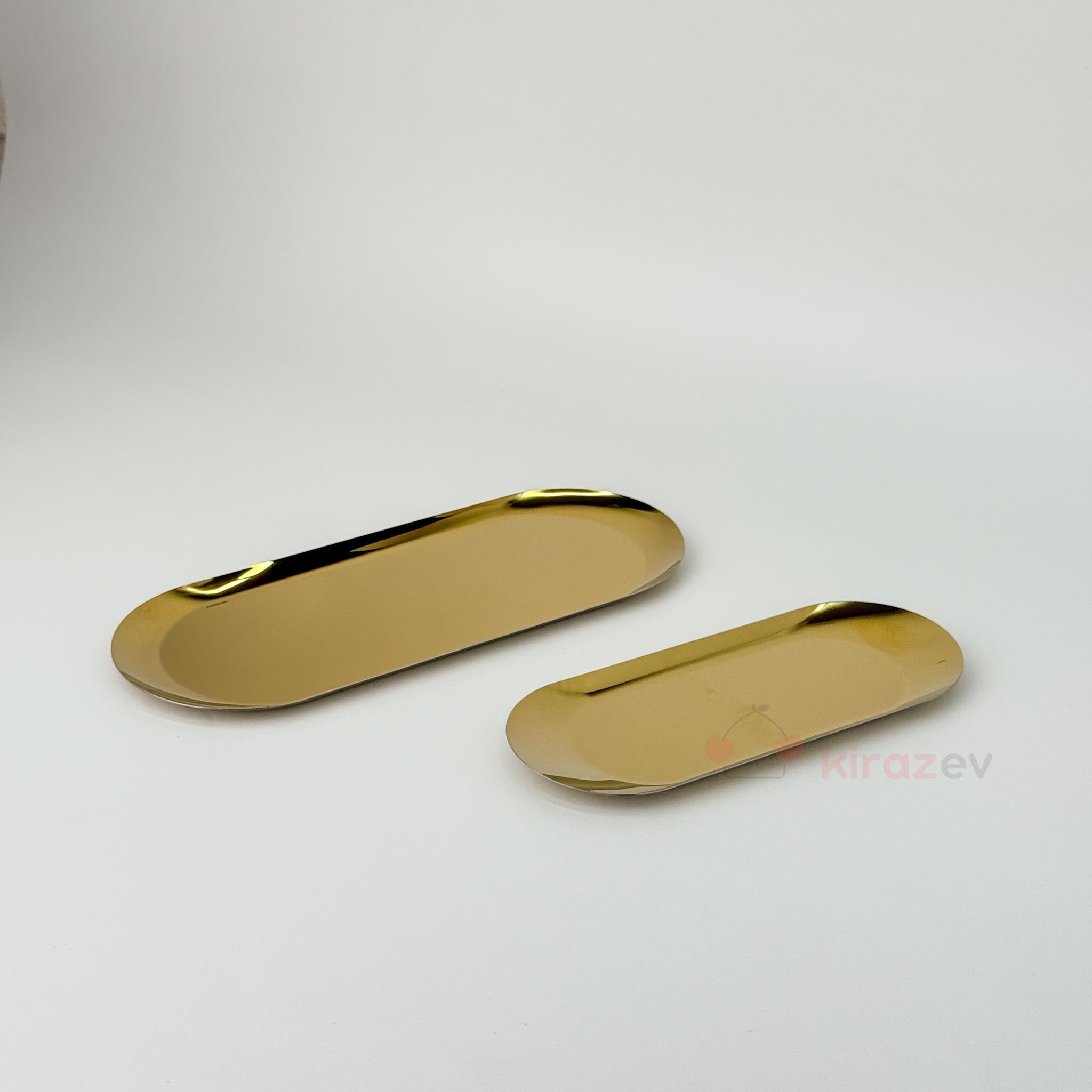 Altın rengi metalik parlak yüzeyi ve zarif oval formuyla öne çıkan bu 2’li kayık tabak seti, sofralarınıza şıklık ve modernlik katmak için tasarlandı. Hem büyük hem küçük boyutuyla çok yönlü kullanım sunar. Takı, mum, tütsü ya da lokum ve çerez sunumlarında kullanabileceğiniz bu set, dekoratif olarak da göz alıcı bir dokunuş sağlar.