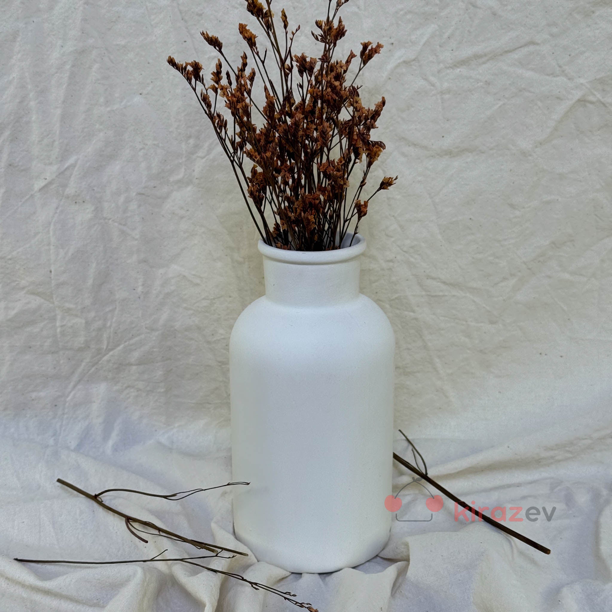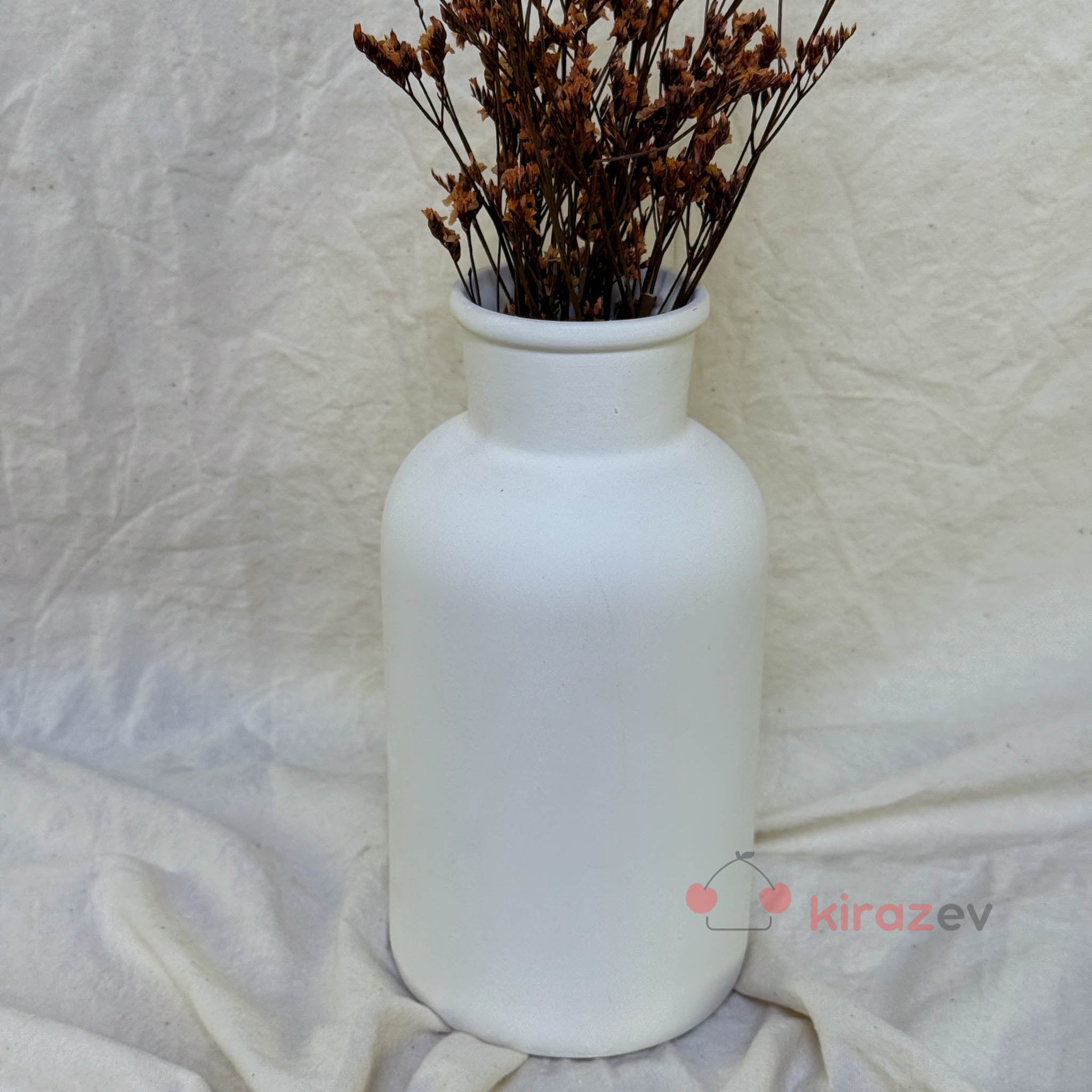 Minimal formu ve mat beyaz yüzeyiyle öne çıkan dar boğazlı beyaz seramik vazo, modern ve ferah yaşam alanları için zarif bir dekor tamamlayıcısıdır. Kuru çiçek ve tek dal aranjmanlar için idealdir.