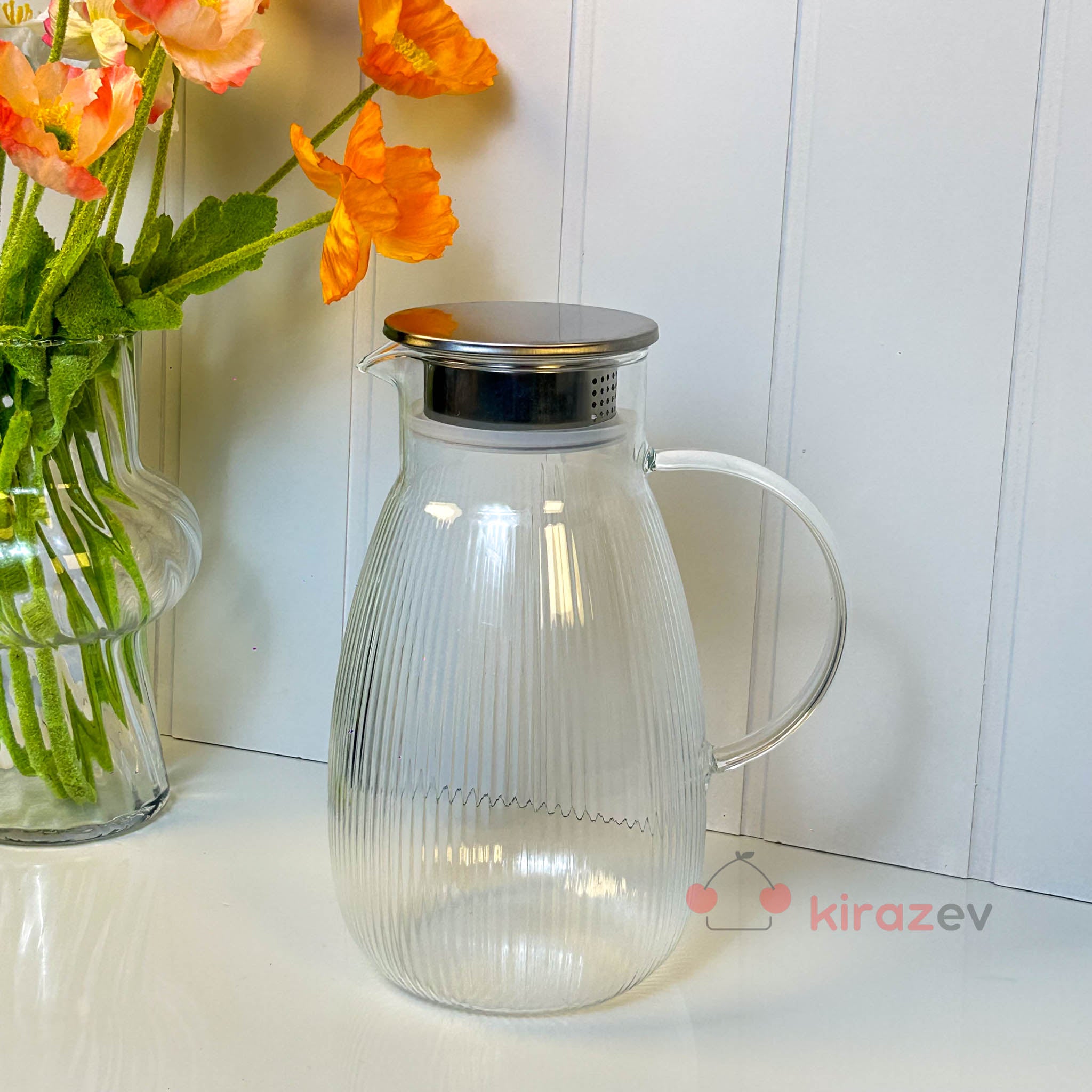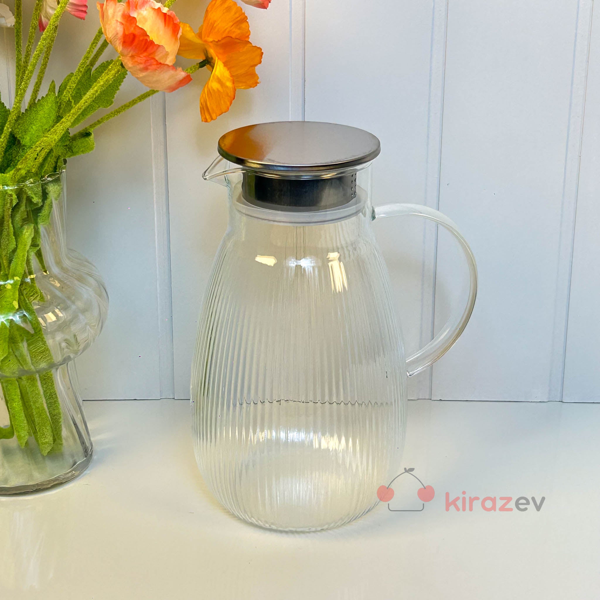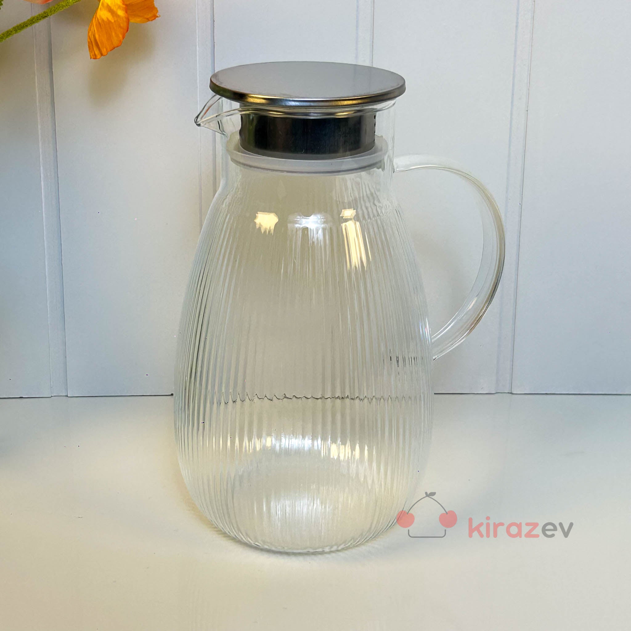 Damla Form Çizgili Cam Sürahi – Metal Kapaklı