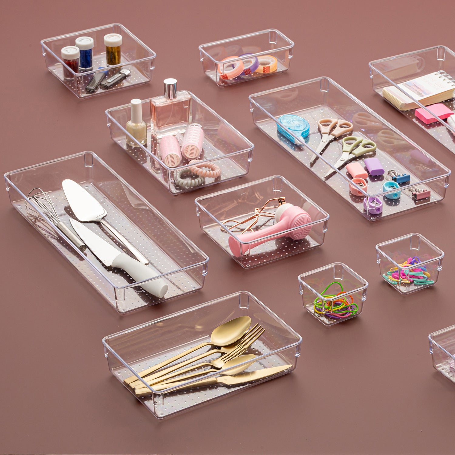 Pratik ve şık tasarımıyla şeffaf punto çekmece organizer, mutfak, banyo, ofis ve makyaj çekmecelerinde düzeni kolayca sağlamanıza yardımcı olur. Kaymaz punto tabanı sayesinde eşyalar sabit durur ve çekmece içinde kayma yapmaz.